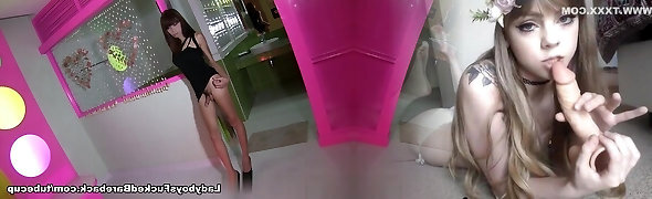 Softcore transsexual amateur massaging her hard dong on a dining table