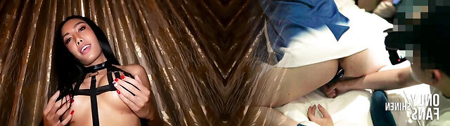 Slutty japanese ladyboy in leather straps gets barebacked