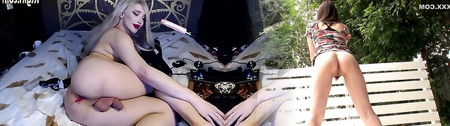 Dark-haired trannie spoons her favorite counterpart with a grand gusto