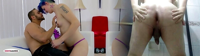 Purple haired huge-titted she-creature TS Foxxy gives awesome BJ to aroused stud