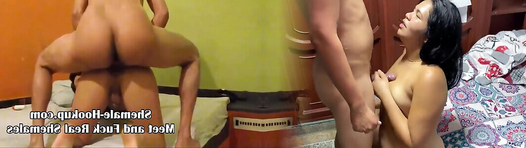 Stunning brunette tranny gives lucky guy some amazing head and gets fucked
